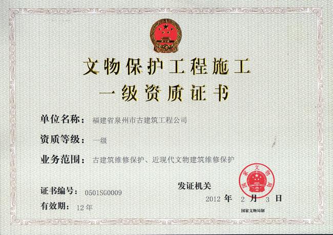2012年2月,榮獲“文物保護工程施工”一級資質(zhì)