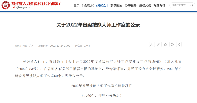 根據省人社廳、省財政廳《關于開展2022年度省級技能大師工作室建設工作的通知》(閩人社文〔2022〕83號),在各地各有關部門推薦申報的基礎上,經專家評審,并經廳長辦公會議…