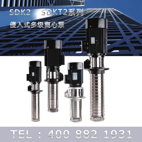 SDK2/SDKT2為配用標(biāo)準(zhǔn)電機(jī)的非自吸立式多級離心泵,電機(jī)軸和泵軸用聯(lián)軸器直接聯(lián)接的結(jié)構(gòu)。為滿足水槽或容器的安裝深度,可安裝空套的腔體來改變泵本身的侵入深度。