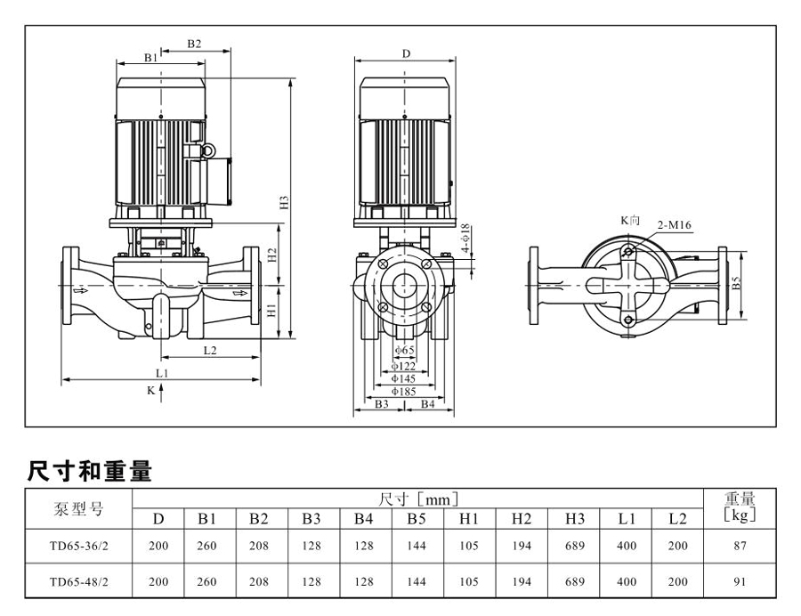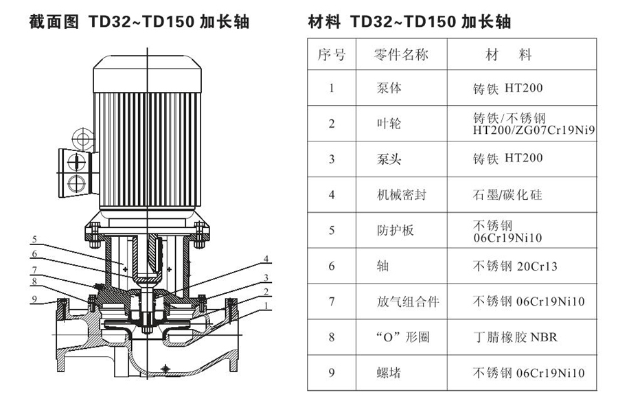 TD65系列單級管道離心泵,配有標準電 機和機械密封。此類產品的結構與相近類型產品相比,更不易受到泵送液體中雜質的影響。產品設計為頂部可拉出的拆裝形式,其可 以在不影響管路系統的情況下對泵進行維修。所有泵采用創新式便拆式機械密封,更好機械密封無需拆卸電機。